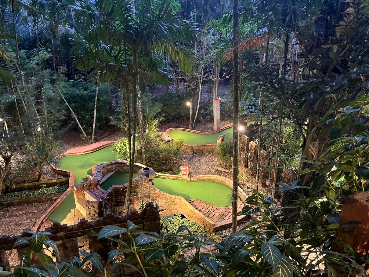 Wir waren an diesem Tag die einzigen Touris (wir plauderten nach dem Kurs noch mit einem der Betreiber dort) und sie empfehlen, dass man am besten direkt um 09:00 Uhr am Morgen spielt. Am Abend ist es zu heiss, da sich die ganze Anlage über den Tag aufheizt und dann auch die Mücken in der grössten Anzahl und am hungrigsten seien – na bravo 🤣