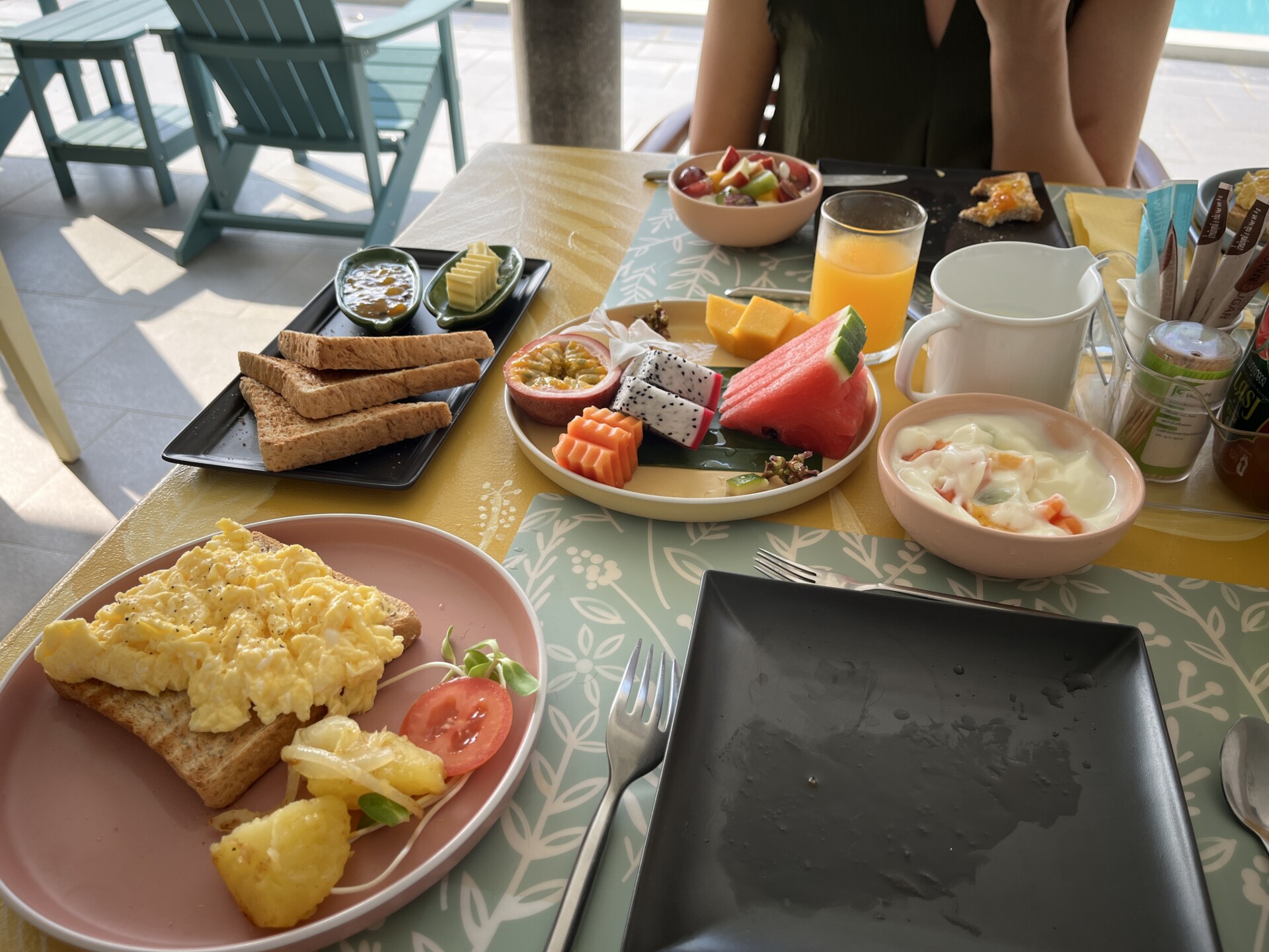 Das Frühstück ist der Hammer. Man geht einfach zum Pool, setzt sich irgendwo hin und dann bringen sie Platten mit Früchten, Joghurt, Toast, Rührei, Tee, Kaffee, Säften und Wasser. Man kann so viel essen wie man möchte. Der Kaffee ist richtig gut hier. Kristin wohnt selbst auf diesem Anwesen, es ist alles sehr heimelig eingerichtet.